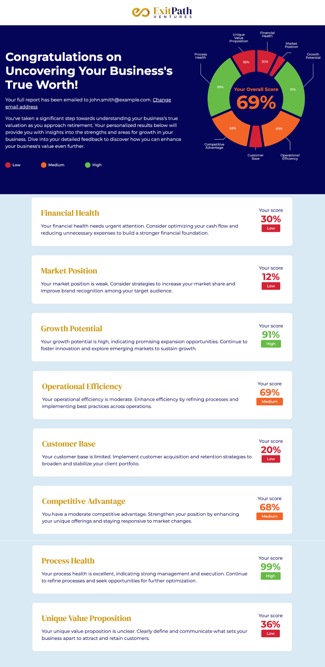 That’s why we created our free 5-minute scorecard. In just minutes, you’ll discover what your business is really worth by assessing it across the 8 key drivers of valuation — Financial Health, Market Position, Growth Potential, Operational Efficiency, Customer Base, Competitive Advantage, Process Health, and Unique Value Proposition.